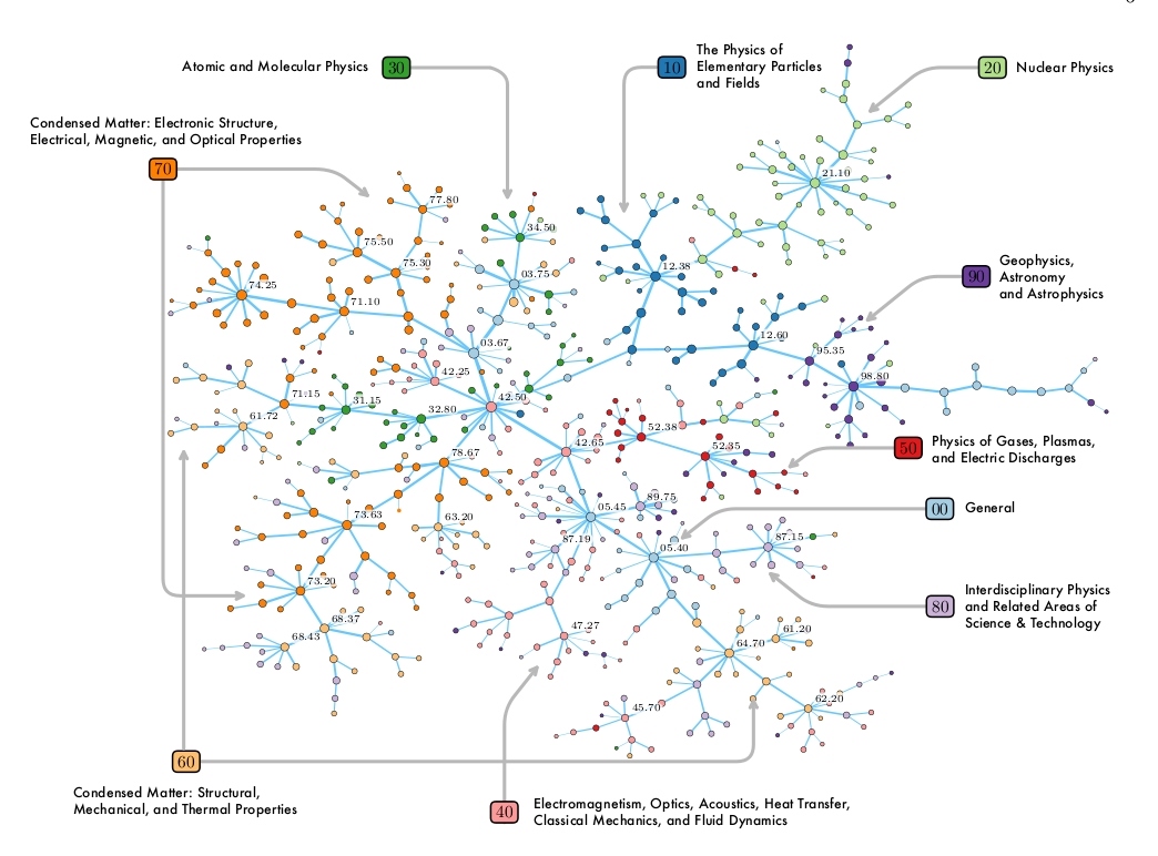 | The maximum spanning tree representing the 2009 connectivity of subdisciplines in physics, as found from their PACS classifications. Click for larger image. (Fig. 5 of ref. 3, via the arXiv Preprint Server).[3] |