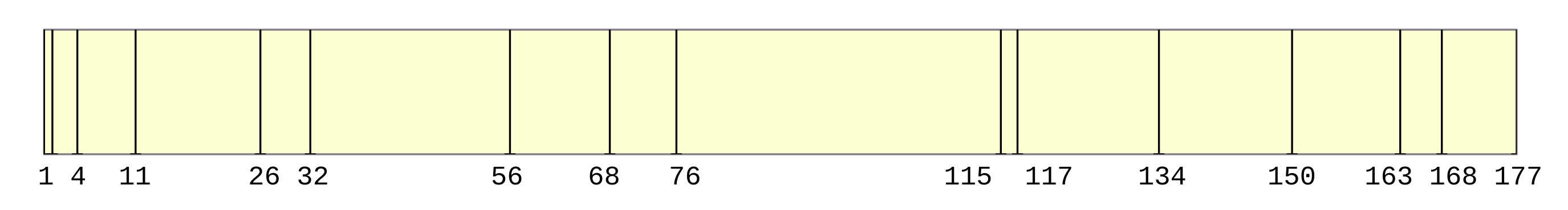 | A Golomb ruler of order 16 and length 177. This ruler, discovered by James B. Shearer in 1986, has divisions at 0, 1, 4, 11, 26, 32, 56, 68, 76, 115, 117, 134, 150, 163, 168, and 177. (Created using Inkscape. Click for larger image.) |