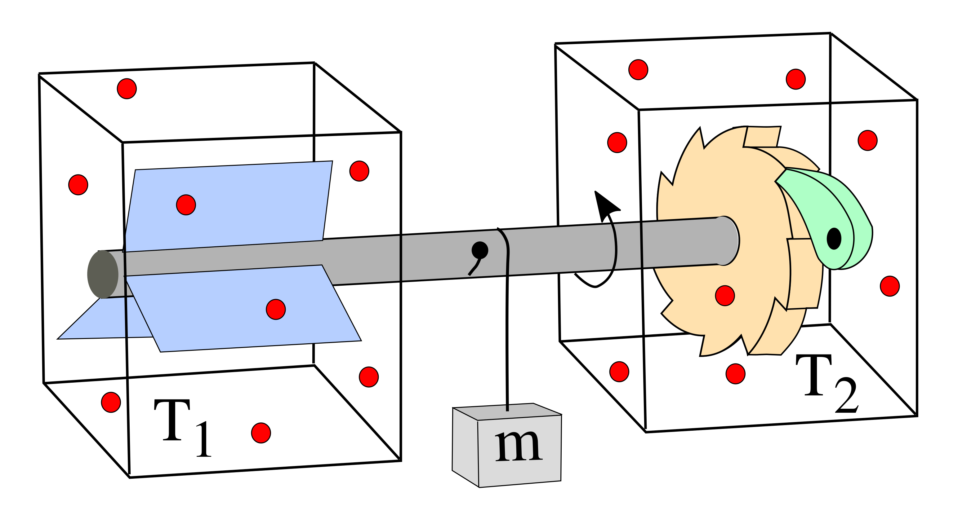 Since this device is part of a thought experiment, its actual size and construction are adjusted so that the paddles will be moved by impact with the gas molecules.