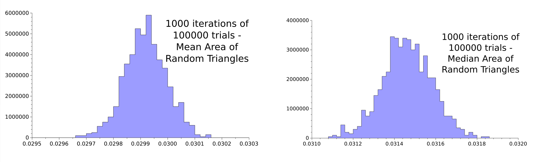 Histograms of mean and median area computations for random triangles. We can be fairly certain that the median area falls between 0.0313 and 0.0317, but this precision is far behind the value of 0.0314584607846627648007001... of an actual calculation. (Created using Gnumeric. Click for larger image).