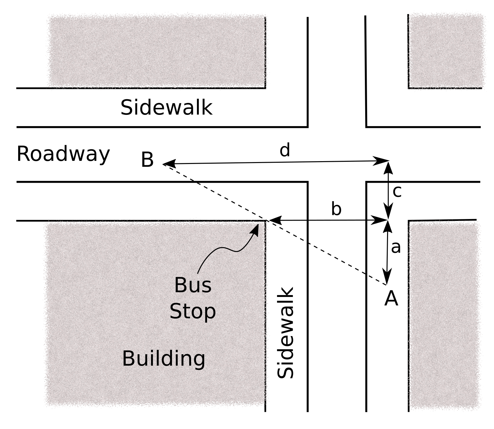The student is at A, and the bus is at B. The bus stop is at the corner of the building, and it's assumed that there is no traffic and no crossing signal to delay travel across the street.