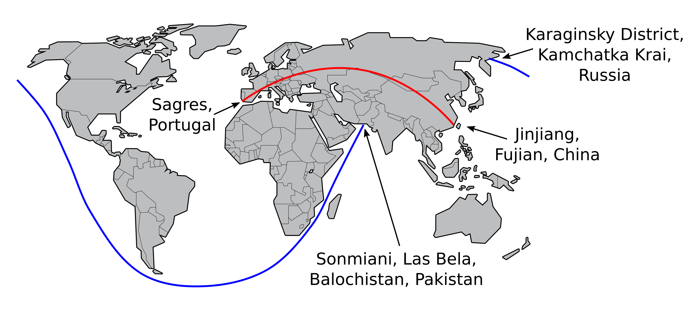Longest land and sea great circle routes on Earth. (Simplified world map by Tom-b, via Wikimedia Commons. Image created using Inkscape from data in ref 4. Click for larger image.)[4]