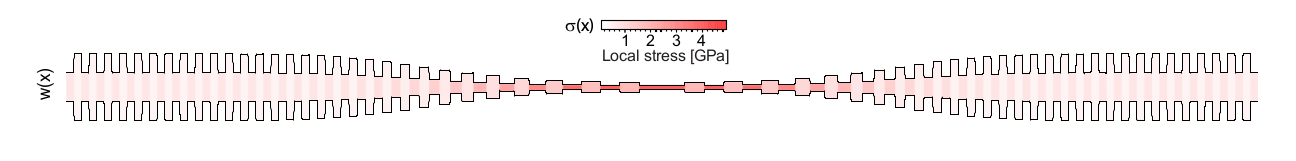 Width and stress profile of a resonator ribbon etched with 60 unit cells. (Fig. 2b of ref. 4. Click for larger image.)[4]