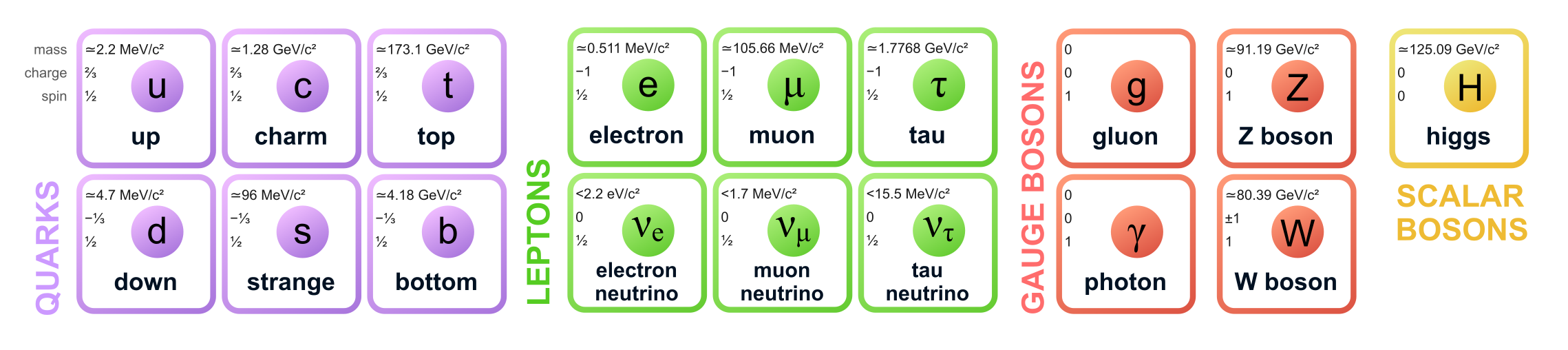 Chart of the elementary particles as understood in the Standard Model. Electrons are part of the lepton class that also includes the muon, tau, and their associated neutrinos. Neutrinos were first believed to be massless, but it's now known that they have a mass that's about a million times smaller than that of an electron. (Modified Wikimedia Commons image by MissMJ. Click for larger image.)