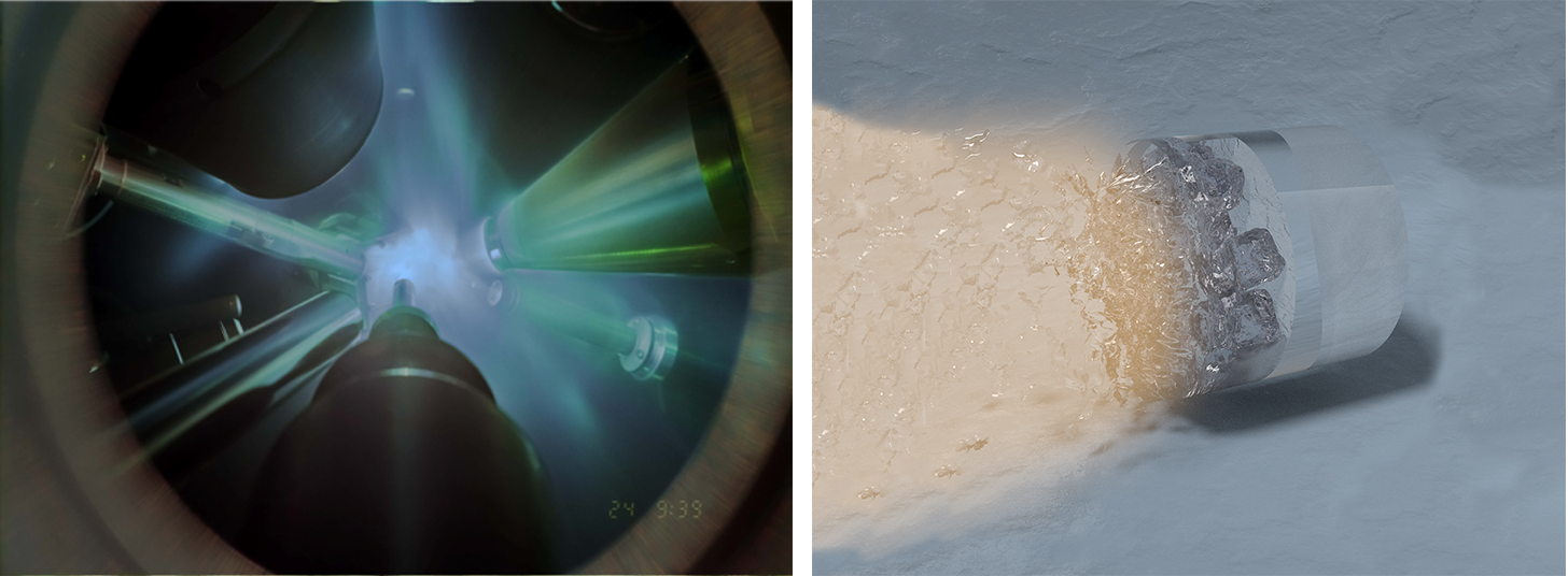 Creation of ice XVIII. The left image is a photograph of the X-ray diffraction experiment in which high power lasers are focused on the water sample to compress it into the superionic ice XVIII phase. Additional lasers irradiate an iron foil to create the X-rays for analysis. The right image is an artist's impression of the laser compression experiment in which water in a diamond anvil cell is compressed by shock waves and heated to produce the conditions for ice XVIII formation. (Left image created by Marius Millot/Federica Coppari(LLNL) and Eugene Kowaluk (LLE); right image created by Marius Millot, Federica Coppari, Sebastien Hamel, and Liam Krauss. Click for larger image.)