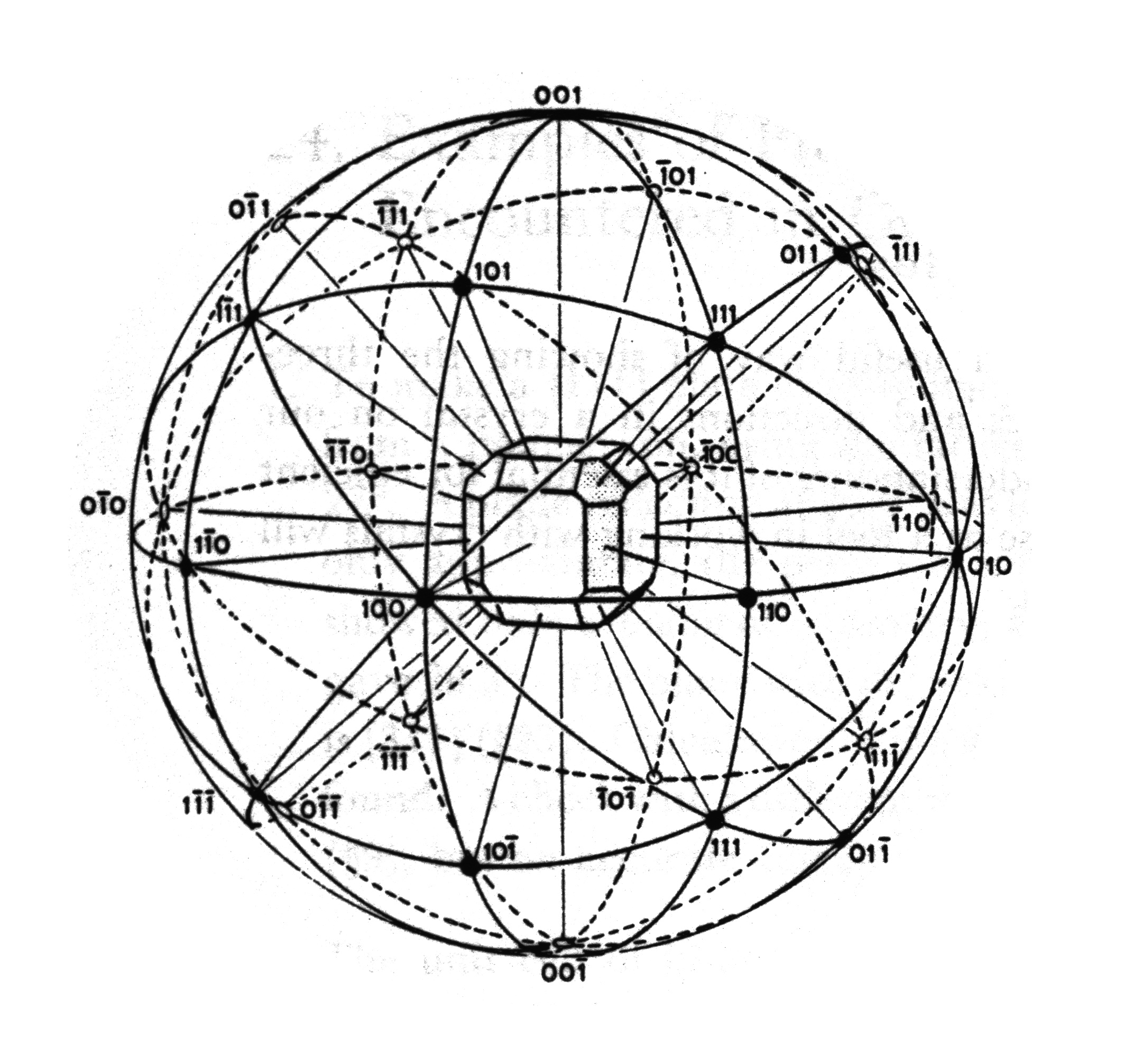 Portion of fig. 1, page 48, of the Crystal Orientation Manual by Elizabeth A. Wood.[8] This illustrates the facets of a cubic crystal.