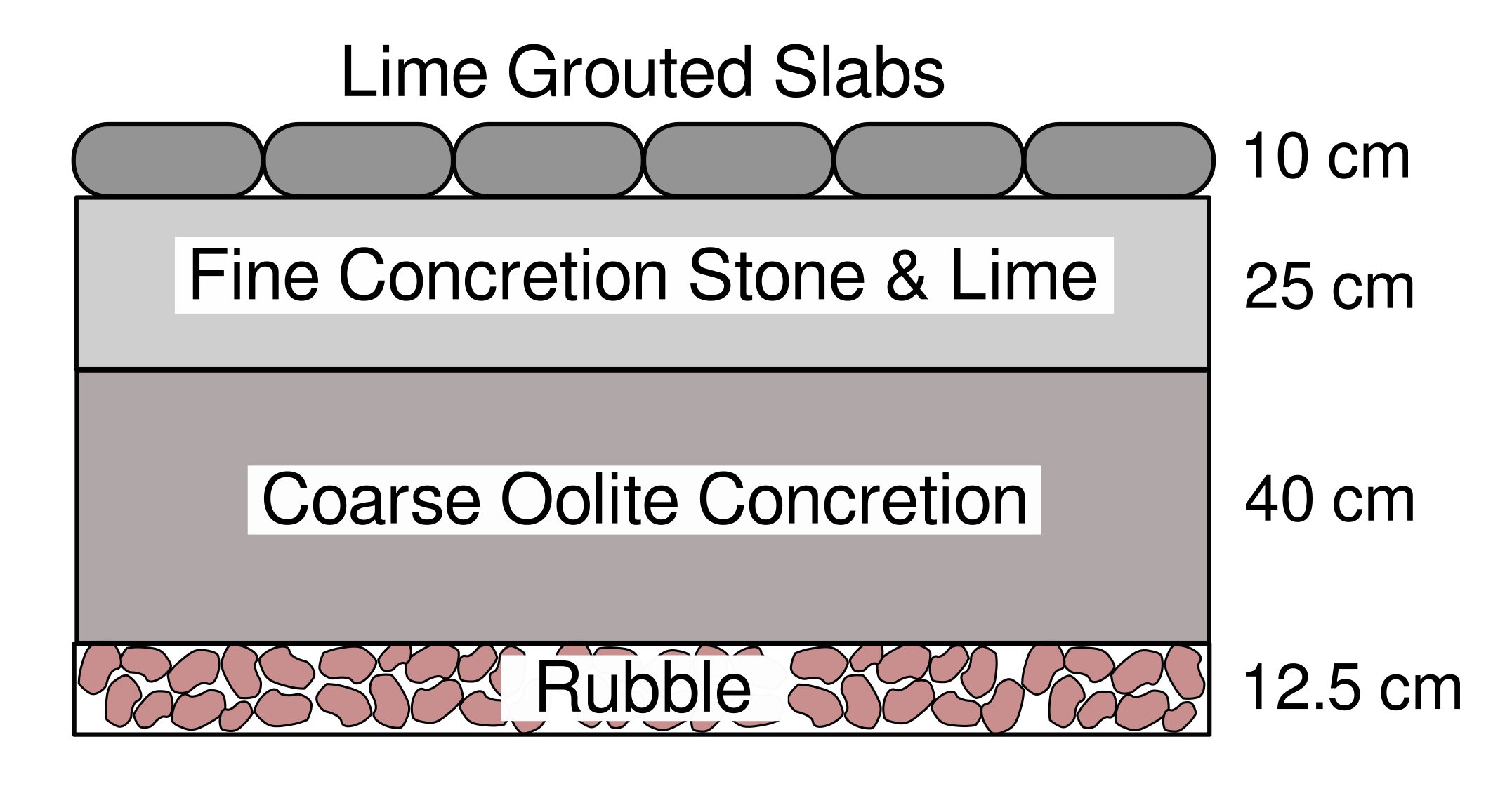 Roman builders used locally-sourced materials, so there are some variations in composition of the Appian Way along its route. The small stones used in the "rudus" layer above the rubble of the "statumen" were usually a type of small, fine-grained sedimentary rock called oolites. (Created with Inkscape from data in ref. 3.[3] Click for larger image.)