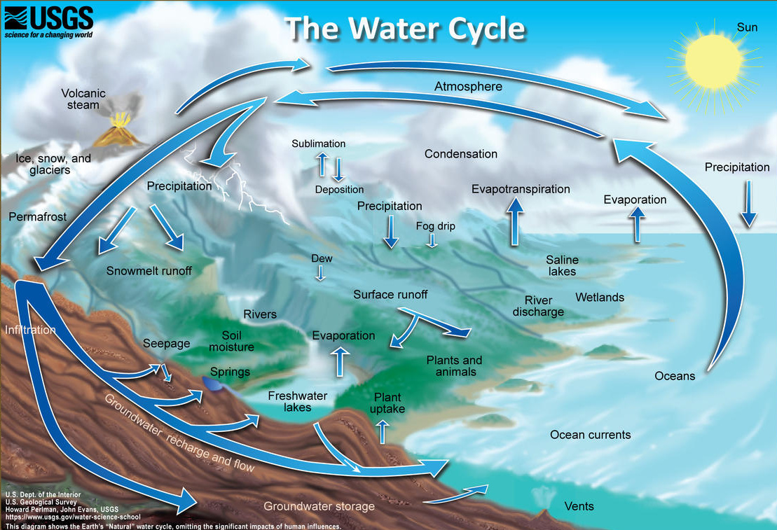 The terrestrial water cycle. (USGS image by John Evans and Howard Periman, via Wikimedia Commons. Click for larger and more detailed image.)