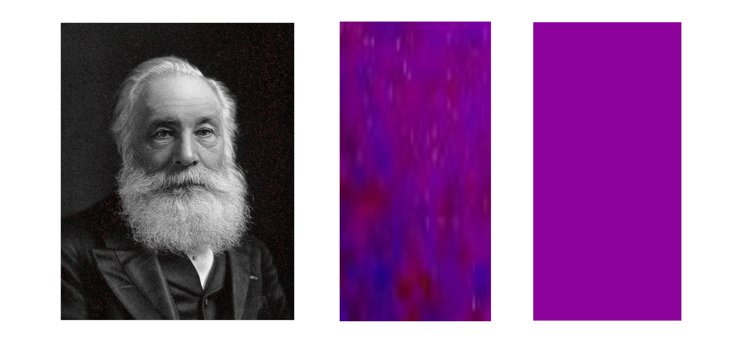 William Henry Perkin (1838-1907) in 1906 is shown on the left, with a photograph of a patch of mauveine dyed silk that he made at the center, and a box on the right that's colored with the acknowledged #8D029B hexadecimal color code for mauveine. (Left image, a 1906 photo of William Henry Perkin from A History of Chemistry (1918) by F. J. Moore. Center image, a portion of a photograph by Henry Rzepa. The left and center images are from Wikimedia Commons. Click for larger image.)