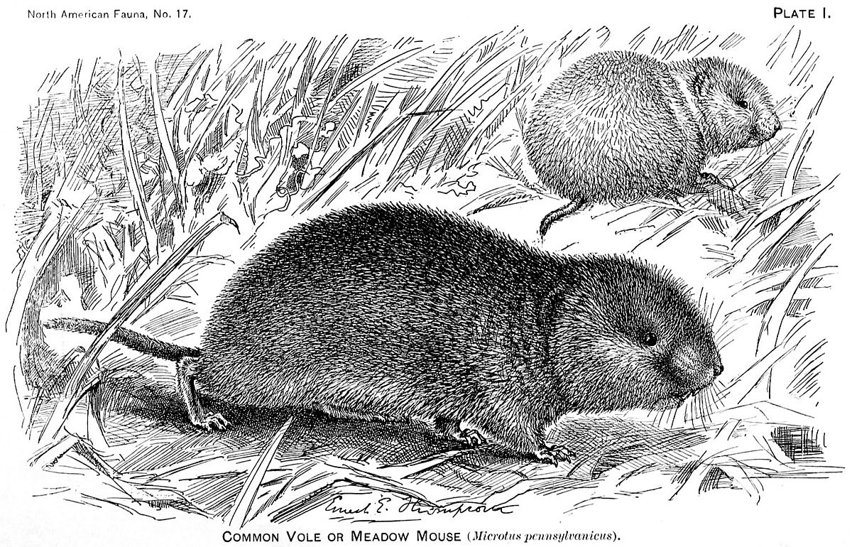 An illustration of the common field mouse, Microtus pennsylvanicus, from a 1900 United States Division of Biological Survey publication, "Revision of American voles of the genus Microtus," by Vernon Bailey and Clinton Hart Merriam.