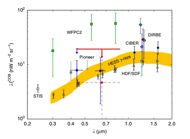 The cosmic optical background (COB), as determined by ref. 4, is shown as both an upper limit (red) and a mean (red star). Previous results in the literature are shown, also.