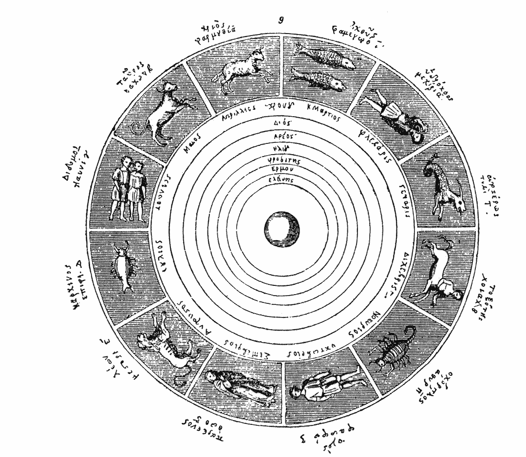 Plate 9 of the Christian Topography of Cosmas Indicopleustes, showing the Ptolemaic system.[1] Shown are the twelve signs of the Zodiac and the names of the Roman and Egyptian months. The names of the Roman months are written in Greek characters. (From ref. 1. Click for larger image.[1])
