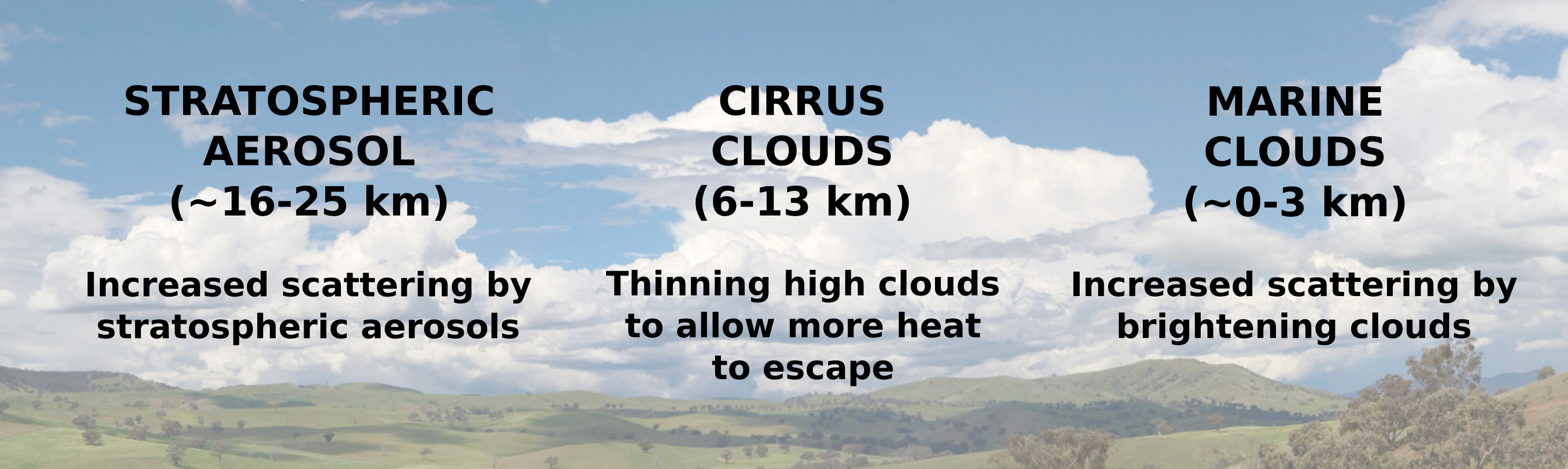 Three methods of atmospheric solar geoengineering. (Data from a National Academies of Sciences, Engineering, and Medicine 2021 report.[1] Background image via Wikimedia Commons. Click for larger image.)