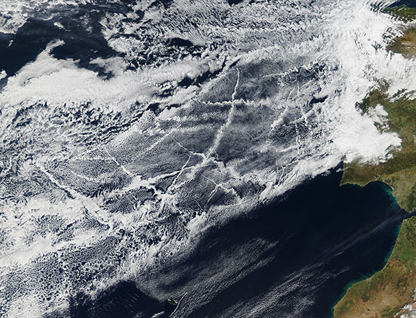A checkerboard pattern of clouds off the coast of Spain on January 16, 2018, created by ships traveling over the North Atlantic Ocean.