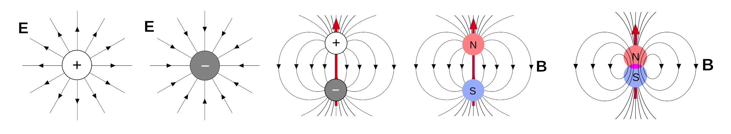 From left to right, positive and negative electric monopoles, an electric dipole, an analogous pair of magnetic monopoles, and an actual magnetic dipole. Magnetic monopoles, which would be isolated north or south magnetic poles, have not been observed.