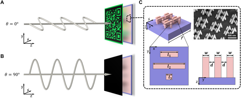 Principle of the metamaterial polarization security tag. The colors appear for horizontally polarized incident light (a), but are concealed for vertically polarized light (b). The metamaterial structure is shown at the right. (Fig. 1 of ref. 1,[1] also appearing here.[2] POSTECH illustration licensed under the Creative Commons Attribution 4.0 International License. Click for larger image.)