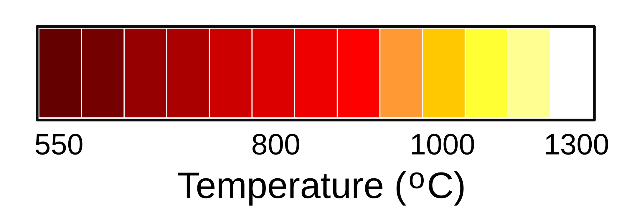 Colors associated with incandescent temperatures. The temperature scale is not linear. There will be a slight variation from material to material, since filaments are not ideal black bodies. (Modified Wikimedia Commons image by RaySys. Click for larger image.)
