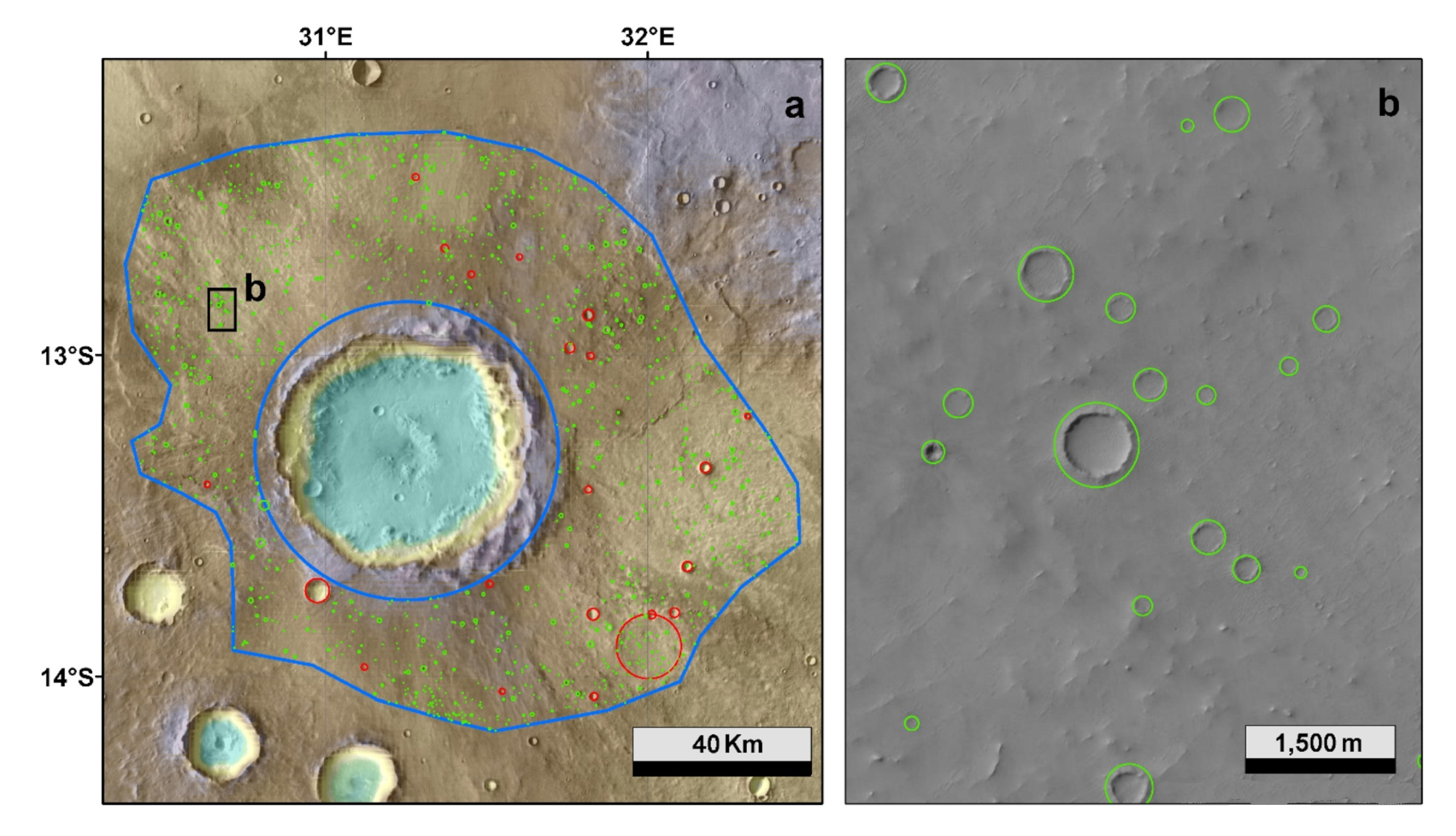 Crater counts on the ejecta blanket of a 40 kilometer impact crater. On the left, the ejecta blanket is outlined in blue, and the automatically detected craters are shown in green. Th red circles highlight impact craters larger than a kilometer in diameter. At the right, a close-up of a part of the ejecta blanket showing detected craters. (Fig. 2 of ref. 2, licensed under a Creative Commons license.[2] Click for larger image.)