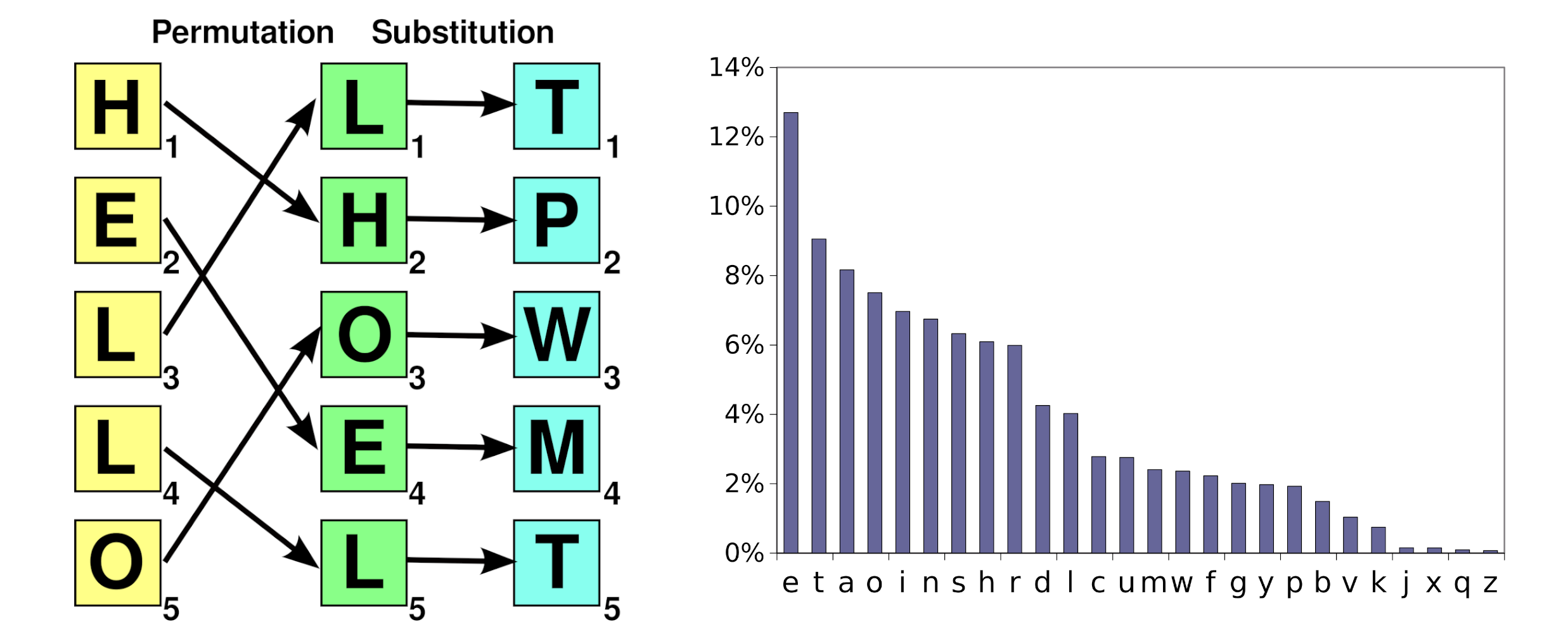 Left, the basic cipher operations of permutation and substitution. Permutation and substitution must happen by known rules derived from a passcode in order for the operations to be reversed to decrypt the encrypted message. The simple cipher in Poe's story, "The Gold-Bug," used substitution alone; so, letter frequency analysis (right) allowed an easy decryption.