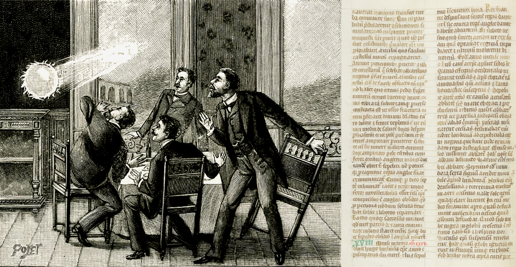 Left, a 19th century engraving depicting ball lightning by Lantzy via Wikimedia Commons. Right, a Durham University photograph of a portion of the Chronicle of Gervase of Canterbury (c.1141-c.1210) where the medieval monk describes his observation of ball lightning, courtesy of The Master and Fellows of Trinity college, Cambridge, MS R.4.11, p.324. (Click for larger image.)