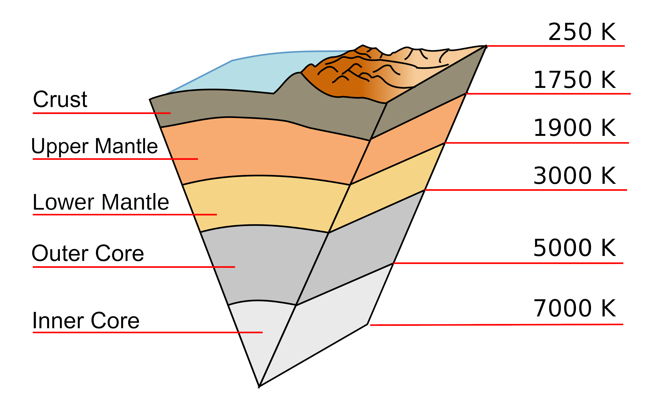 A cutaway diagram of the Earth along with temperatures along the geothermal gradient.