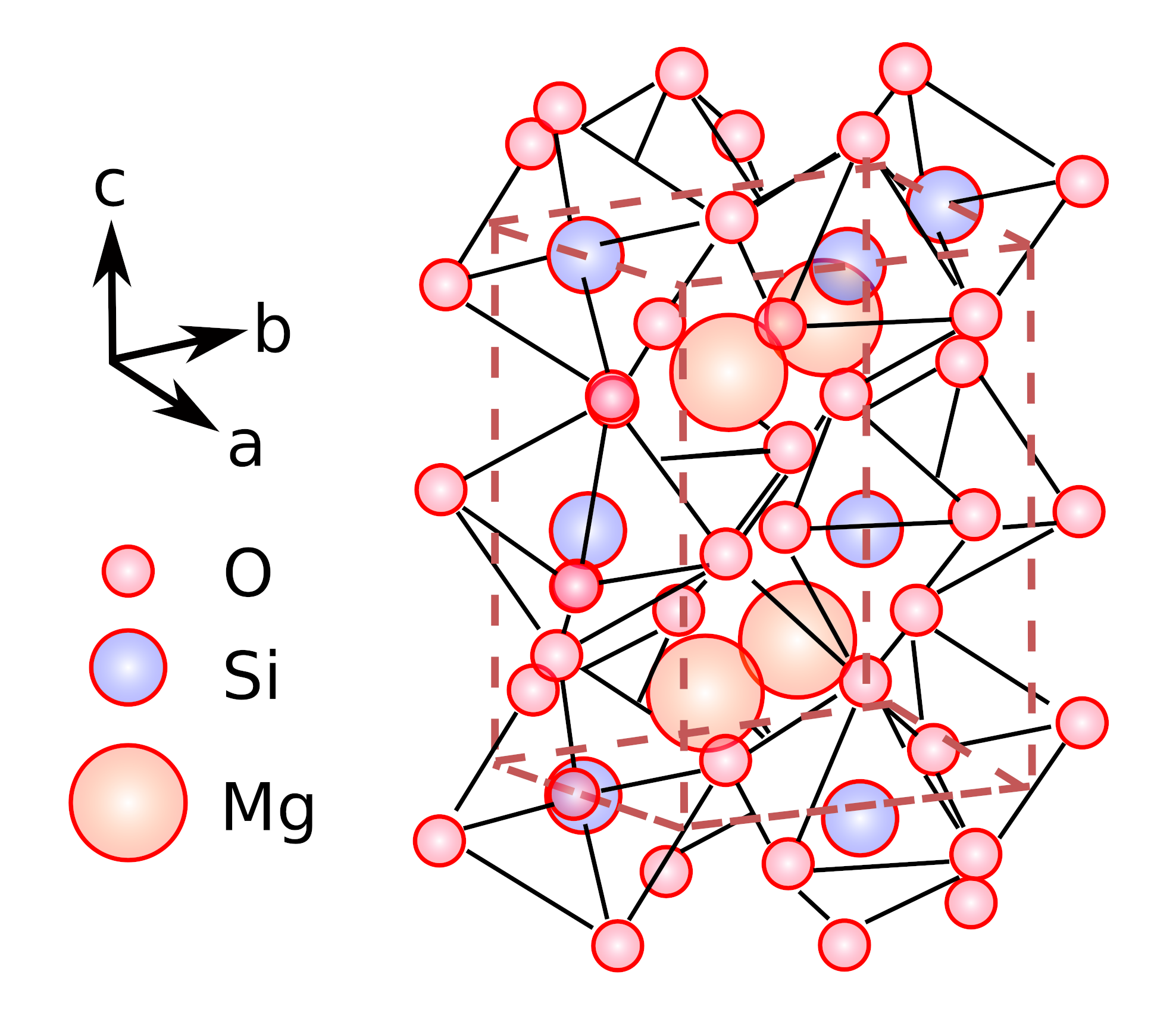 Bridgmanite has the orthorhombic crystal structure (Space group, Pnma). It has silicon atoms surrounded by oxygen in six-fold coordination.