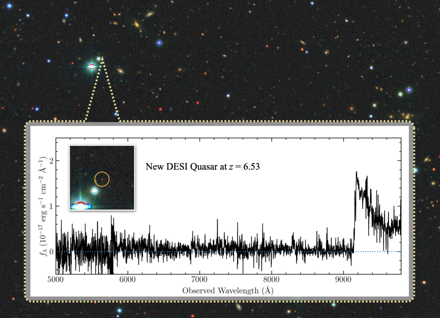 A quasar with a redshift z = 6.53 discovered by DESI. This quasar existed less than a billion years after the Big Bang. For scientists more familiar with nanometers than angstroms, 9000 Å = 900 nm, which places the peak in the near infrared.
