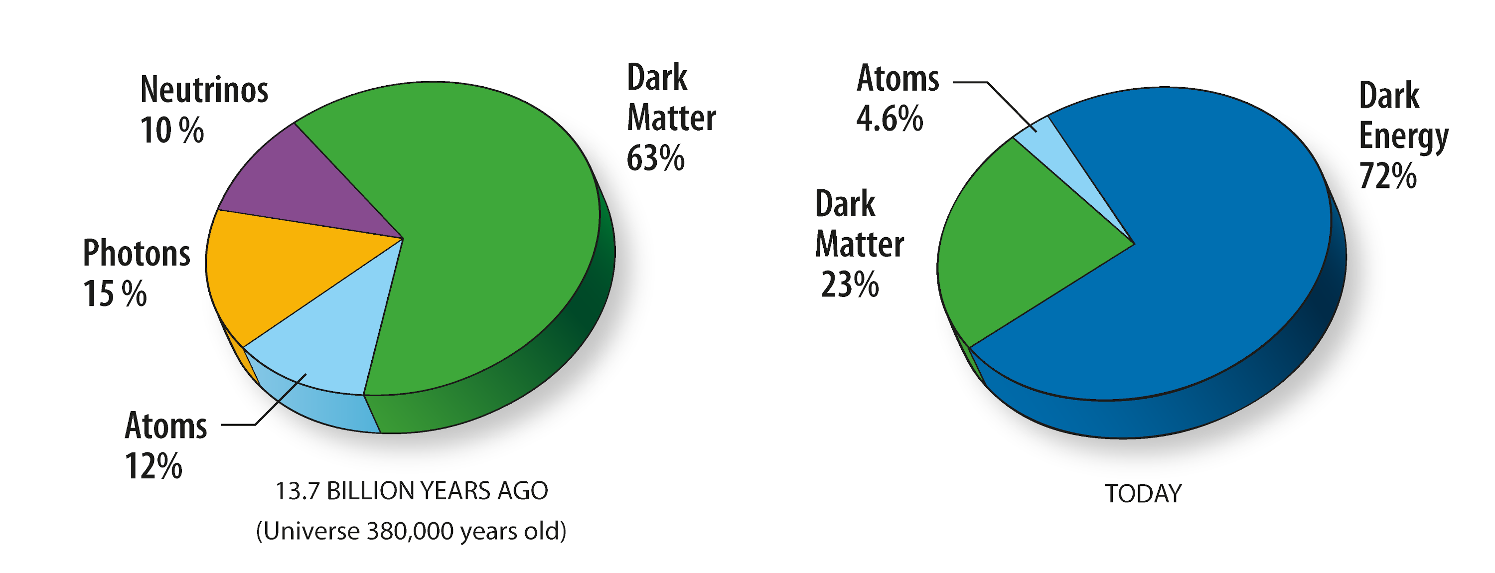Composition of the universe, at an early epoch, and today. These data are from the Wilkinson Microwave Anisotropy Probe.[2] As a consequence of the limited accuracy for dark matter and dark energy detection, the percentages don't add to 100% (Reformatted NASA image by the WMAP Science Team. Click for larger image.)