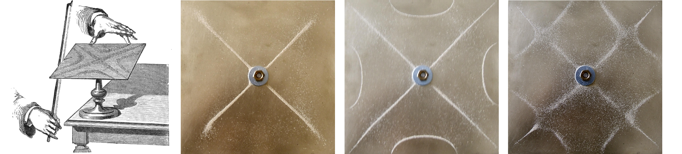 Left, a drawing showing excitation of vibrations in a Chladni plate using a violin bow. Other images show excitation of plates by an audio transducer at various frequencies. (Left image, a Wikimedia Commons image, figure 12 of page 26 from William Henry Stone, "Elementary Lessons on Sound," Macmillan and Co. (London, 1879). Second, third, and fourth images by Elmar Bergeler, also from Wikimedia Commons. Click for larger image.)
