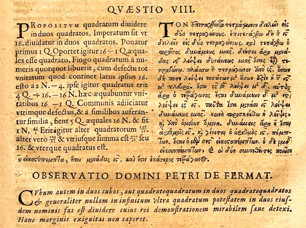 Page 61 of Arithmetica by Diophantus. Fermat's "Last Theorem" note, as published in this edition, appeared after Problem VIII of Book II. Fermat's note reads in translation, "It is impossible to separate a cube into two cubes, or a fourth power into two fourth powers, or in general, any power higher than the second, into two like powers. I have discovered a truly marvelous proof of this, which this margin is too narrow to contain." (Portion of a Wikimedia Commons image. Click for larger image.)
