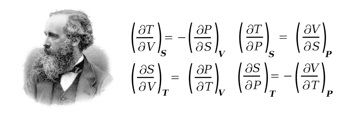 James Clerk Maxwell (1831-1879) is best known for his electrodynamic equations. He also deduced a set of thermodynamic equations, known as his relations to avoid confusion, as shown here. (Left image, an engraving of Maxwell by George J. Stodart from Wikimedia Commons. The equations were rendered using Inkscape. Click for larger image.)