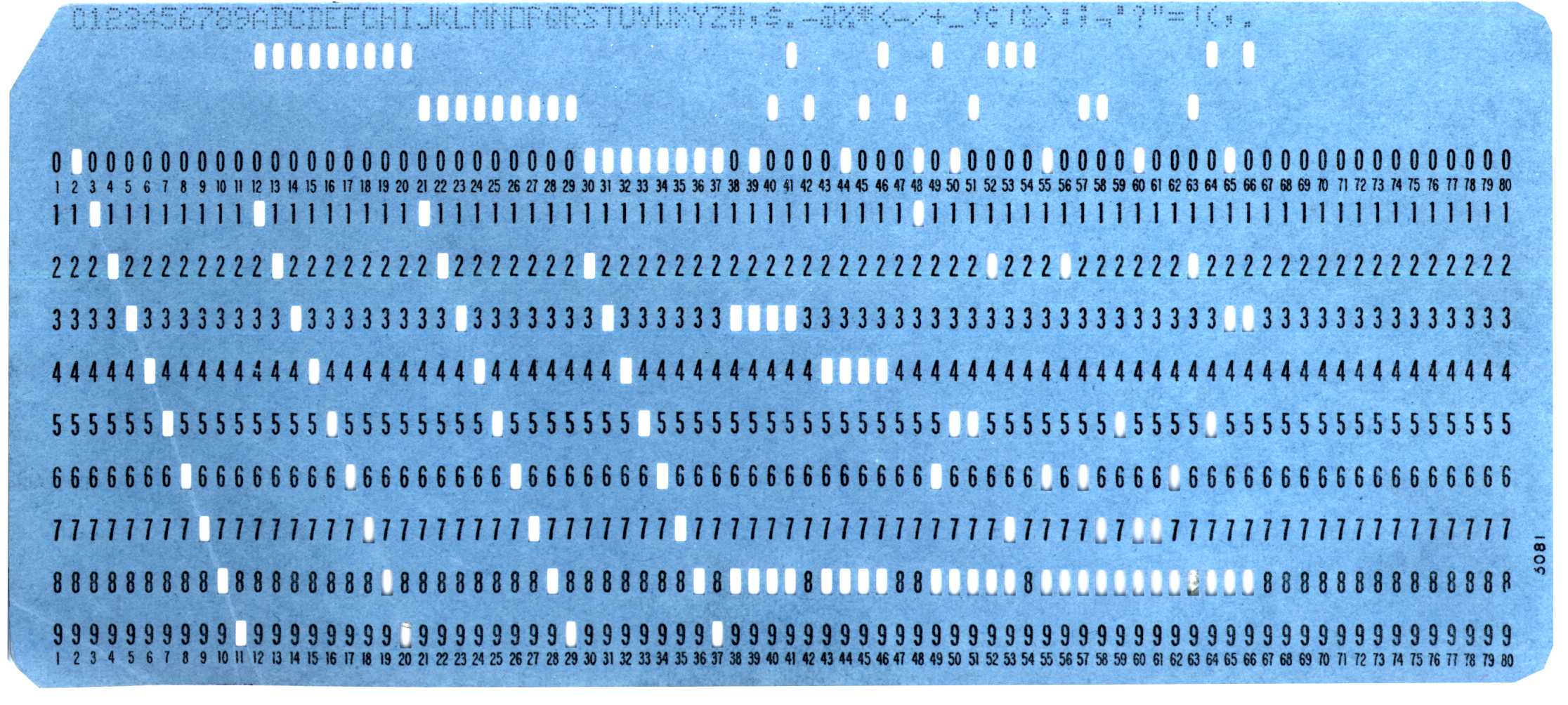An 80 column punch card. Such punch cards were once so common that artisans would make Christmas wreaths and Easter flowers from them. (Enhanced (Wikimedia Commons image. Click for larger image.)