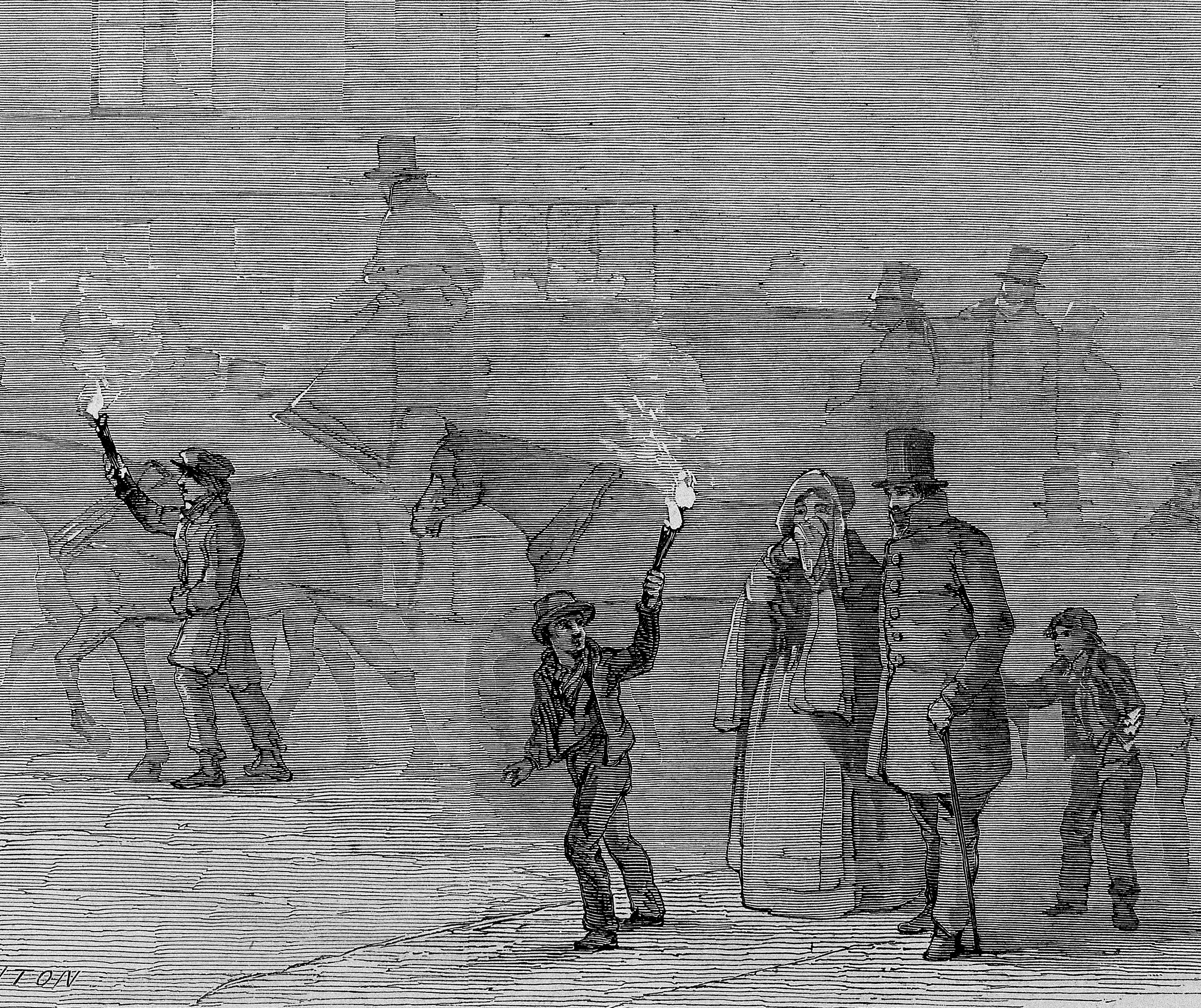 This engraving of a London fog by Henry Linton (1815–1899), published in The Illustrated London News of January 2, 1847, shows people carrying flaming torches to lead the way for others.