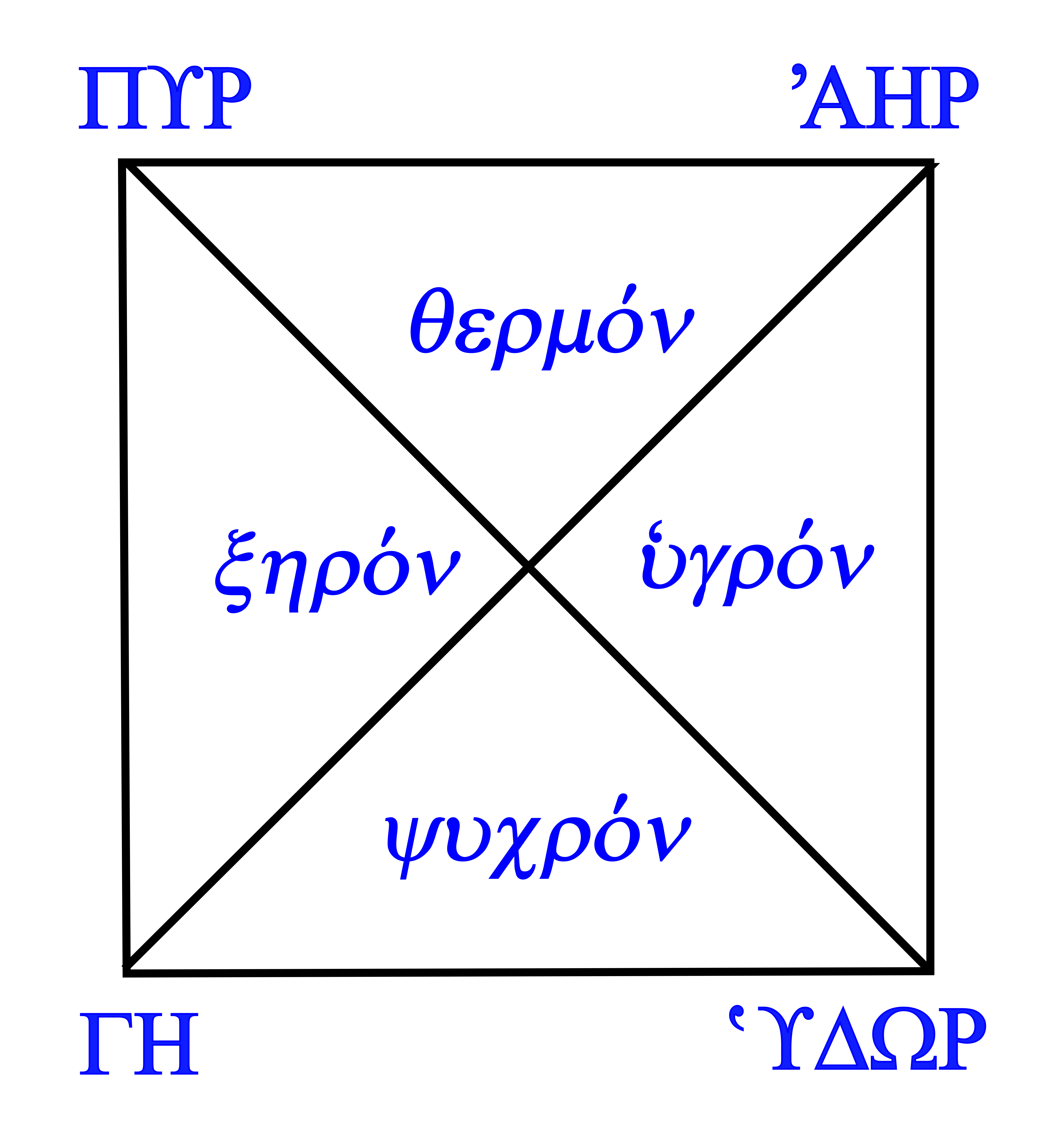 Aristotle, in his On Generation and Corruption, associated each of the four elements with two sensible qualities; namely, Dry (ξηρον), Wet (ʿυγρον), Hot (θερμον), and Cold (ψυχρον).