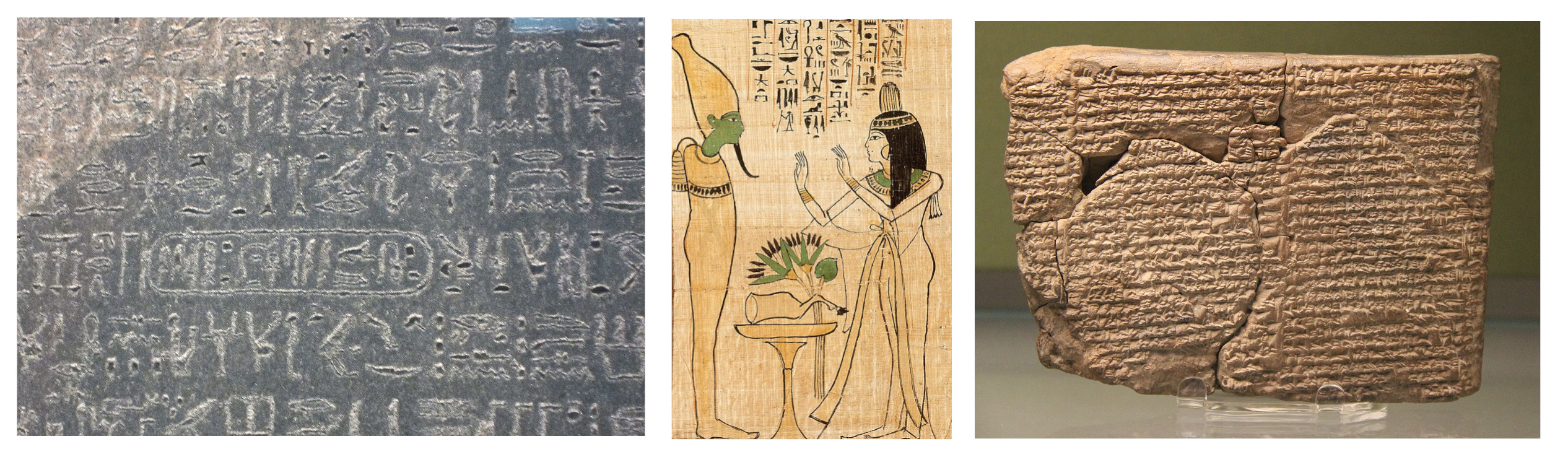 Three very ancient texts. Left, a portion of the Rosetta Stone, 196 BC. Center, a portion of the Book of the Dead papyrus, circa 1050 BC. Right, a clay tablet with cuneiform writing, circa 1525 BC. (Left, a Wikimedia Commons image by Nolde16. Center, a portion of a Wikimedia Commons image from the Rogers Fund, 1930, of the Metropolitan Museum of Art. Right, a Wikimedia Commons image by Gary Todd. Click for larger image.)