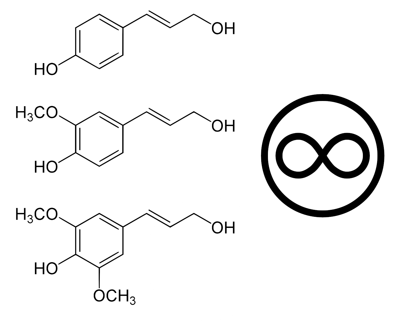 Top, paracoumaryl alcohol, center, coniferyl alcohol, and, bottom, sinapyl alcohol.