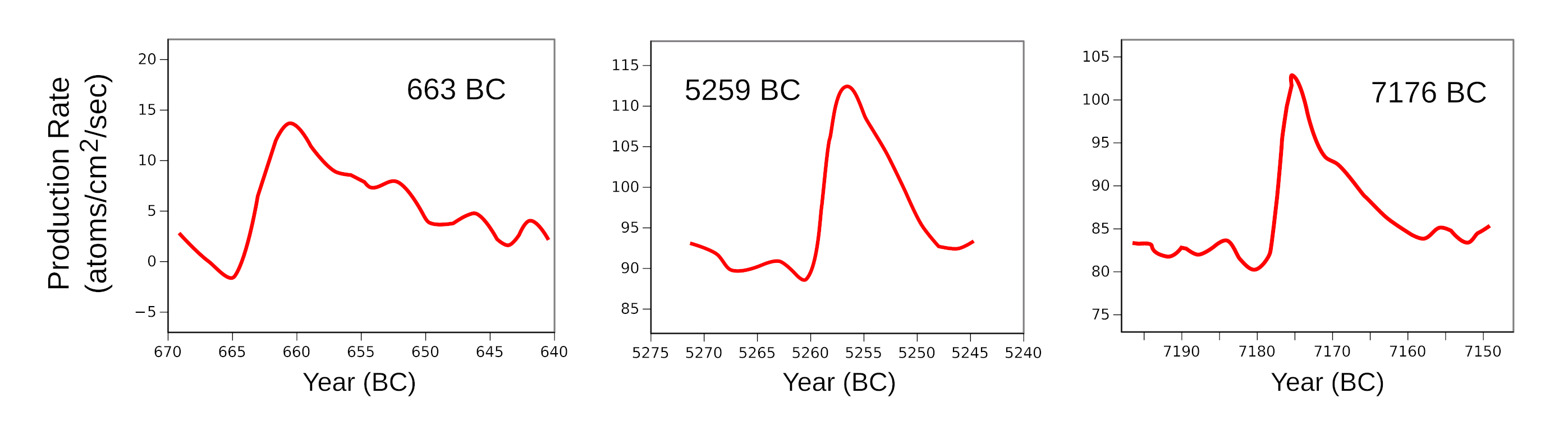 Miyake Events of 663 BC, 5259 BC, and 7176 BC, showing the steep rise in carbon-14 over a period of about a year, and a decade's long decay. This figure is just illustrative, since errors would have been introduced during data transcription. Consult the copyrighted original for precise data. (Created using Gnumeric and Inkscape from data in fig. 2 of ref. 6.[6] Click for larger image.)