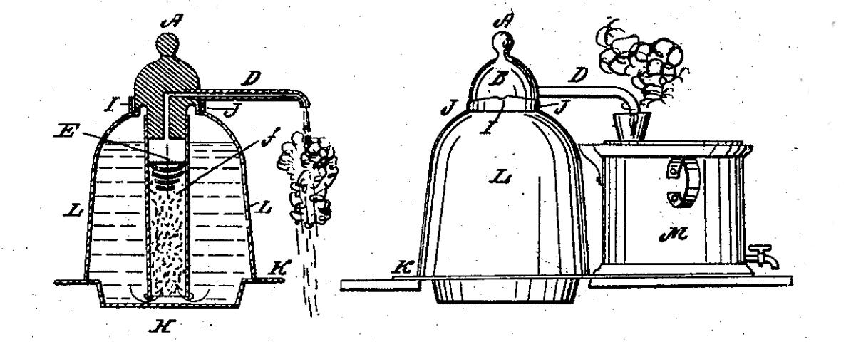 Figures 2 and 3 from US Patent no. 54,933, 'Making Coffee,' by Joe V. Meigs, May 22, 1866. This is possibly the earliest US Patent on a vacuum coffeemaker. The patent text includes the following - "It is the object of my invention to provide an apparatus for making coffee upon philosophical principles, of the best quality to be procured from the berry, and yet so simple and certain in its operation that it can be successfully used by any person of ordinary intelligence, and, in fact, can scarcely be made to fail..." (Image via Google Patents. Click for larger image.)