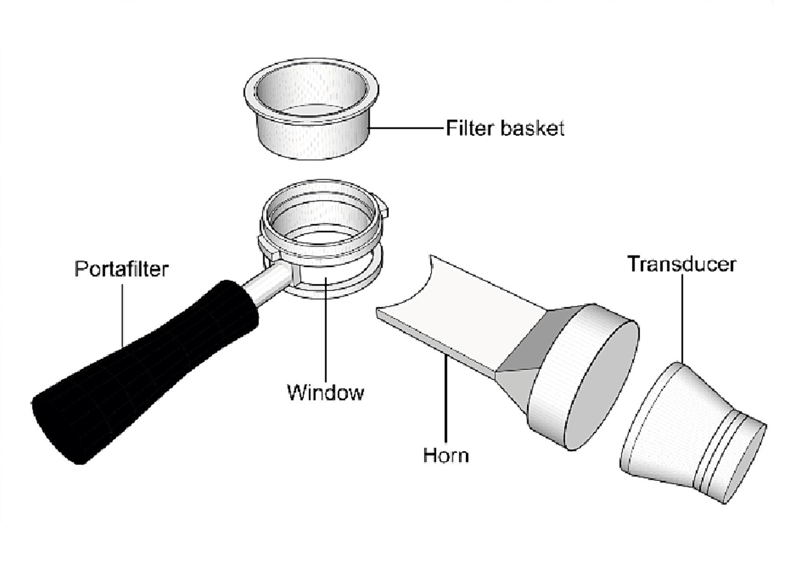 A schematic diagram of the method for coupling of ultrasound into a coffee basket for the University of Queensland experiments on cold brewing of coffee.