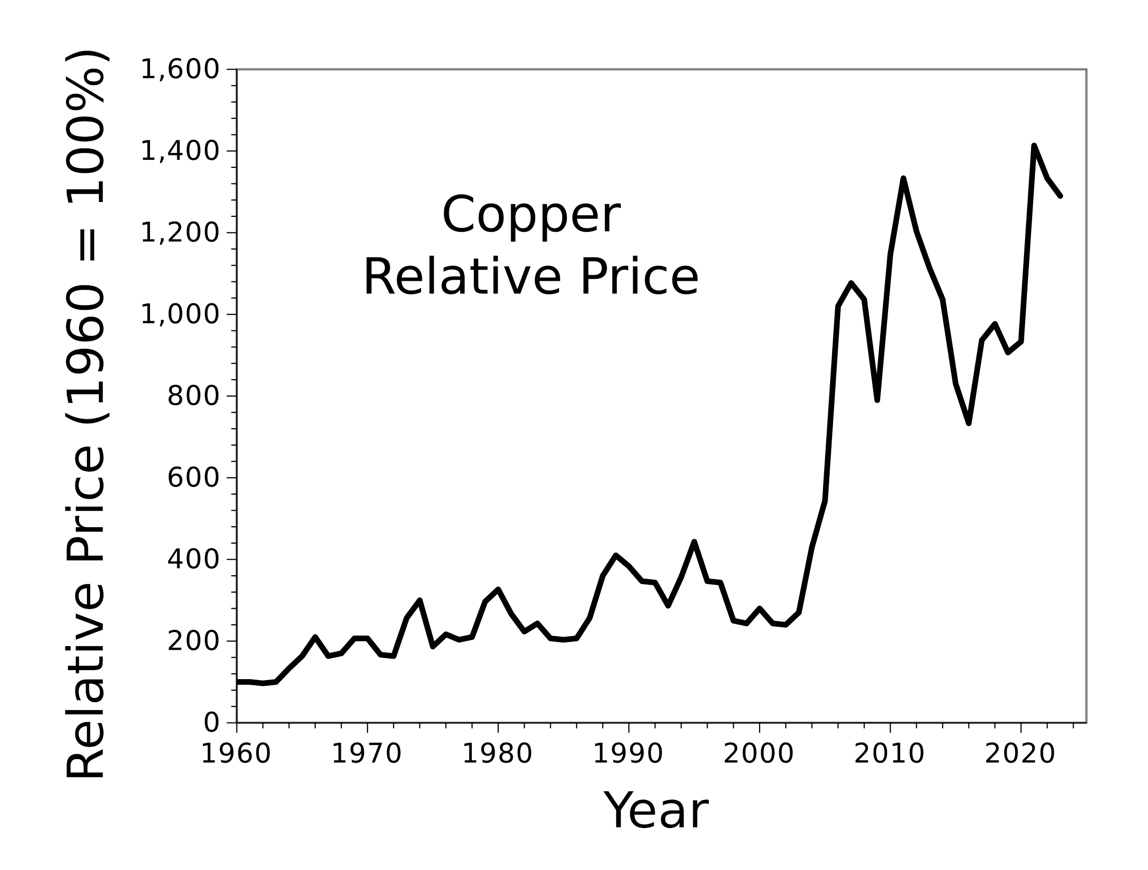 Relative price of copper from 1960 to 2023 (1960 = 100%).
