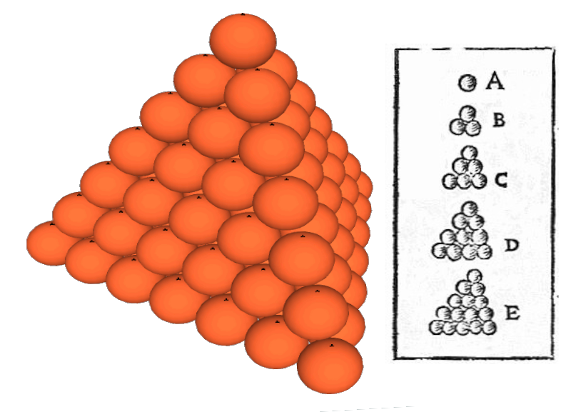 The well-known close-packing arrangement of spheres (right), along with the illustration that Johannes Kepler (1571-1630) used when making the conjecture that this is the densest possible arrangement.
