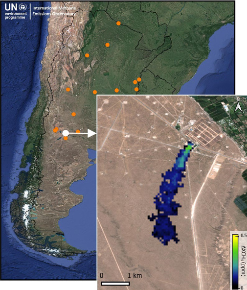 Methane event detections between January, 2021, and August, 2023, in Argentina by the European Space Agency's Sentinel-5P satellite. The orange dots are the estimated locations.